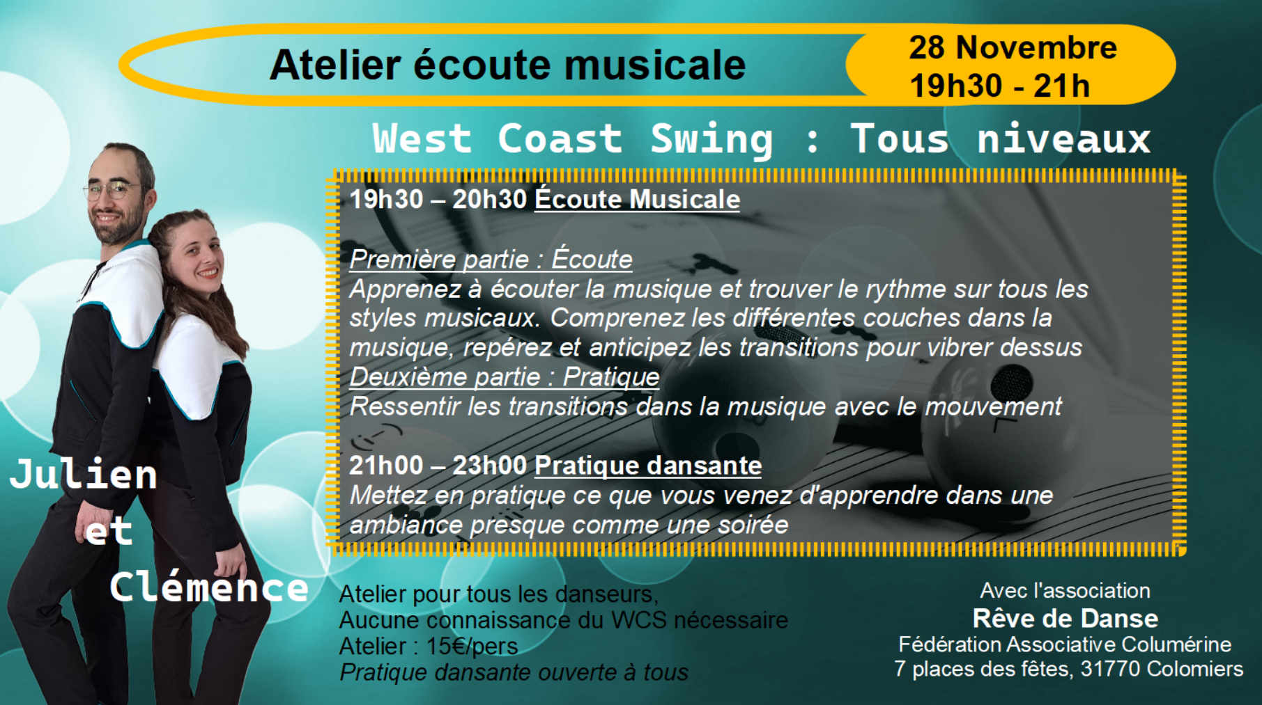 Fédération Associative Columérine 7 places des fêtes, Colomiers, France🎶 Atelier Écoute Musicale & Musicalité - West Coast Swing 🎶 📅 Le vendredi 29 novembre 🕢 19h30 - 21h 📍 7 Place des Fêtes, 31770 Colomiers Vous aimez danser, mais souhaitez mieux ressentir la musique ? Venez développer votre écoute musicale et votre musicalité ! Que vous soyez débutant ou confirmé, cet atelier est […]