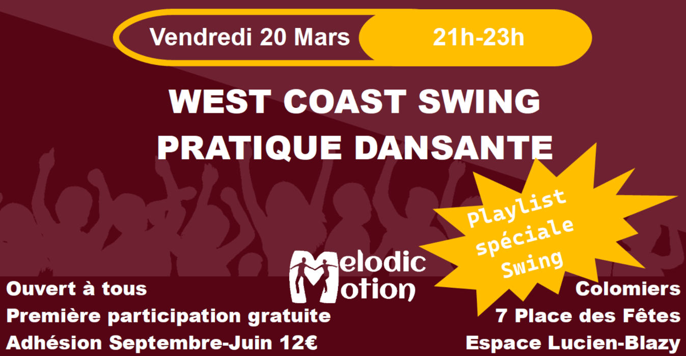 Fédération Associative Columérine 7 places des fêtes, Colomiers, France🎶 Atelier de West Coast Swing : Danser sur les musiques Swing ! 💃🕺 Dans West Coast Swing, il y a "Swing", mais c'est quoi le swing ? Venez apprendre à apprécier danser sur le style musical qui a donné son nom à notre danse 🙌 👉 Quand ? Le vendredi 20 mars, de 19h30 […]